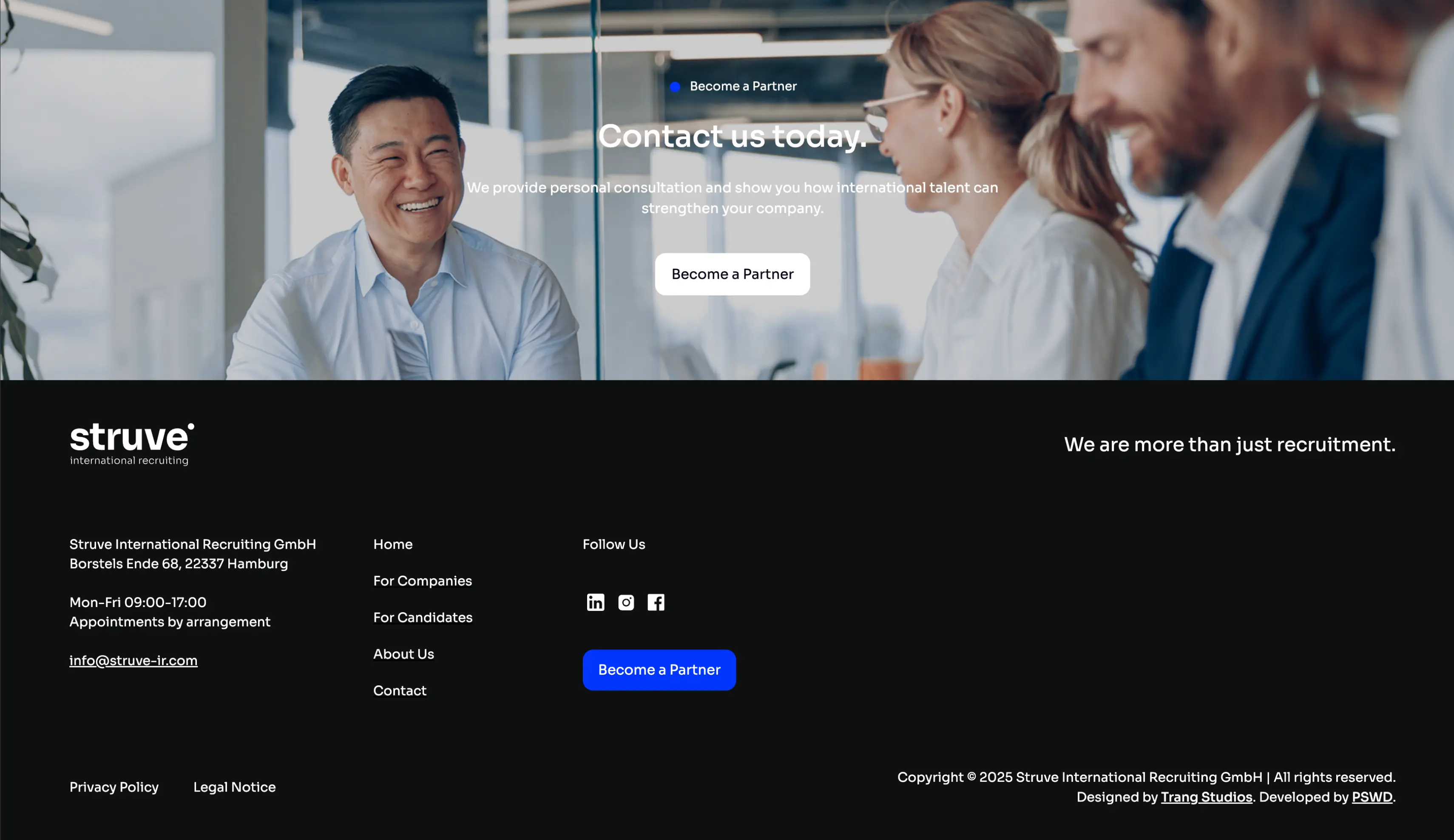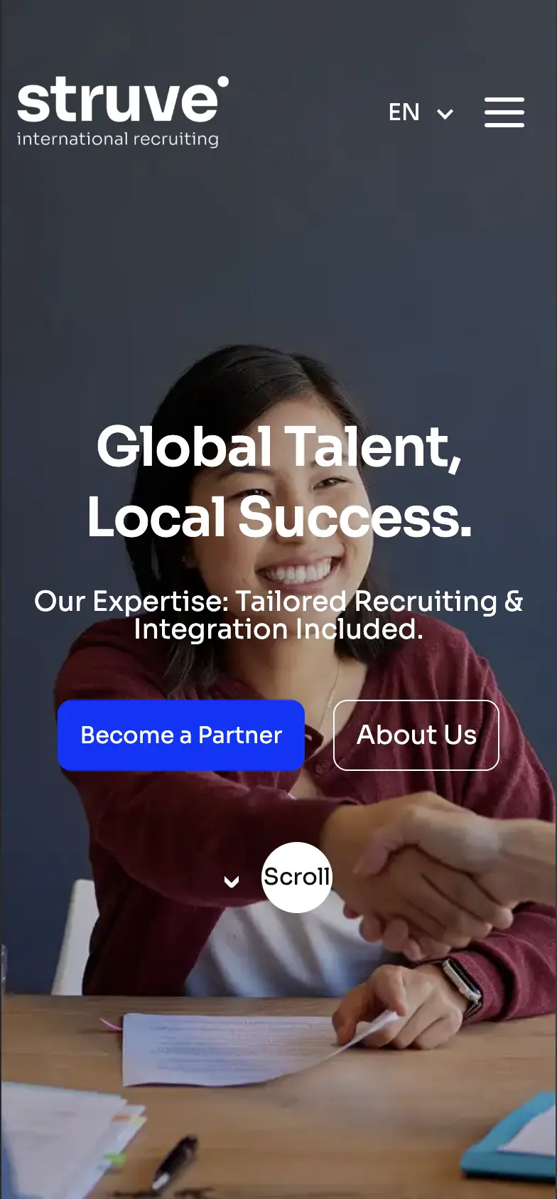 Struve International Recruiting is an international, family-led recruiting business. The company focuses on building long-term, high-quality connections between professionals and companies, with a strong emphasis on trust, clarity, and personal relationships. As the business evolved, it became clear that the existing brand and website no longer matched the level at which Struve was operating. The new website needed to communicate professionalism instantly, provide clear orientation for visitors, and create a solid foundation for the company’s next growth phase.